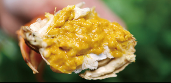 黃油相融,難分彼此。油膏浸滿整只蟹身,腹肉、蟹腿、蟹螯,甚至蟹腮,全身都金黃透光。細(xì)細(xì)品嘗,渾身散發(fā)一股霸道的鮮甜,是普通青蟹的10余倍,簡直就是“人間尤物”。